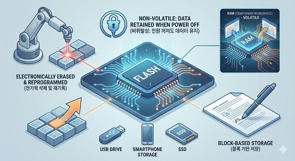 💾 Flash = 프로그램 저장, 전원 꺼도 유지 (비휘발성)