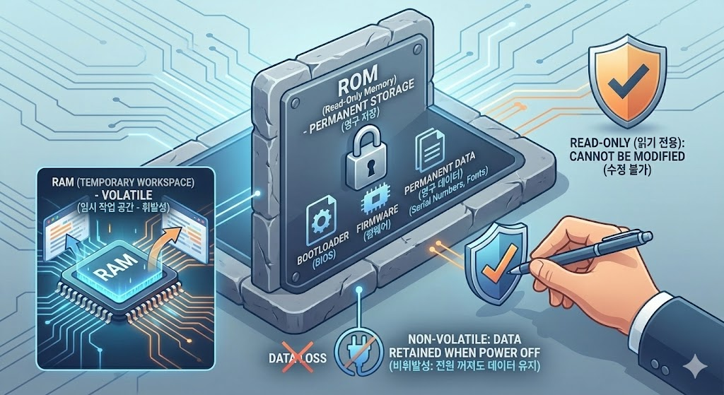 📦 ROM = 부팅 코드, 절대 바꾸지 않음 (읽기 전용)